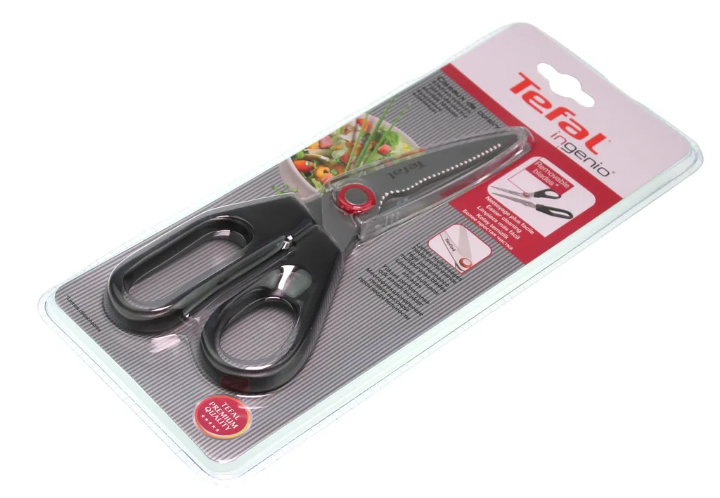 Schere gekerbt INGENIO TEFAL Kunststoff und Klingen aus rostfreiem Stahl, Farbe: rot und schwarz – bequeme Griffe, um effektiv geschnitten – Cache Sicherheit und Hygiene für das Utensil halten – Ideal zum Backen oder Zubereiten von Fisch – eine bevorzugte Reinigung der Hand abnehmbare Klingen für die Bequemlichkeit.