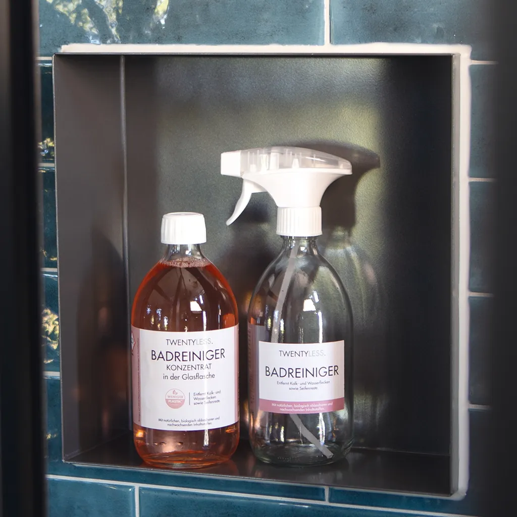 Die clevere Alternative zu herkömmlichen Reinigern basiert auf einem Konzentrat mit natürlichen, biologisch abbaubaren und nachwachsenden Inhaltsstoffen. Gib einfach mit der wiederverwendbaren Dosierkappe die empfohlene Menge TWENTYLESS in die leere Glasflasche, füll diese mit Leitungswasser auf und fertig ist der Sanitärreiniger!