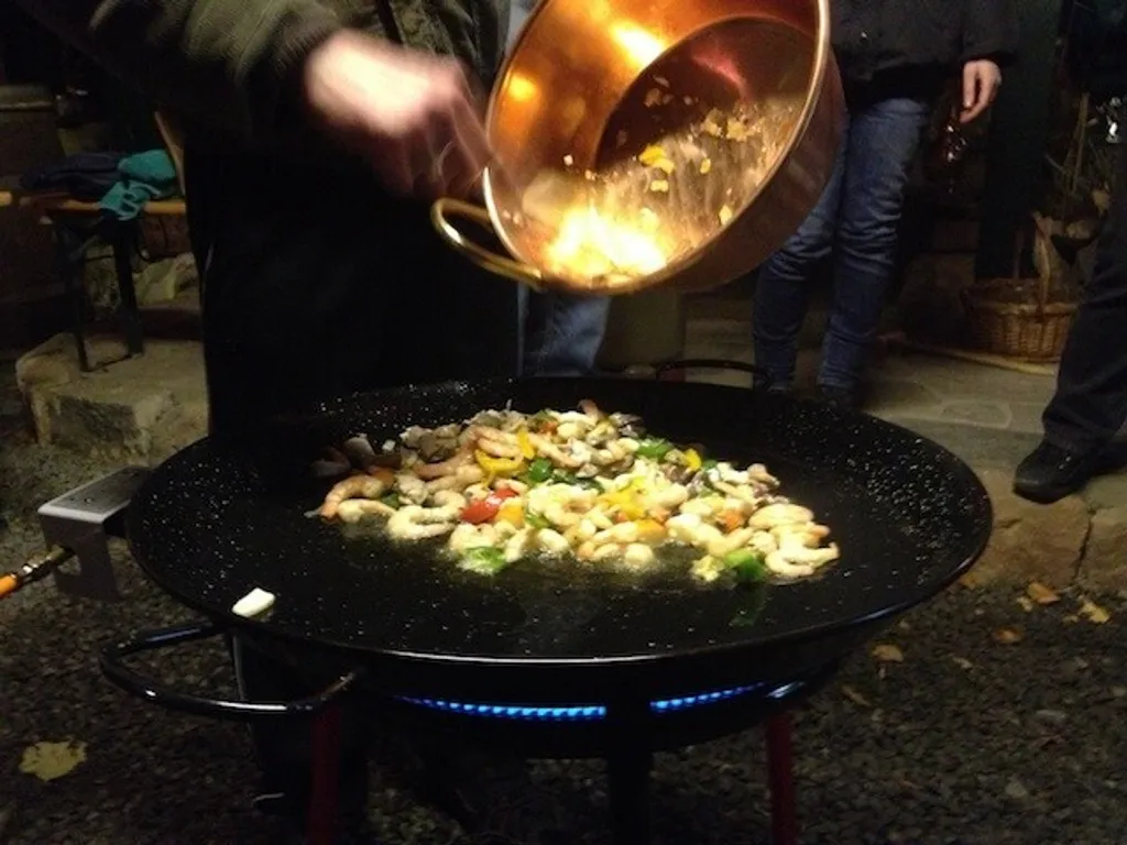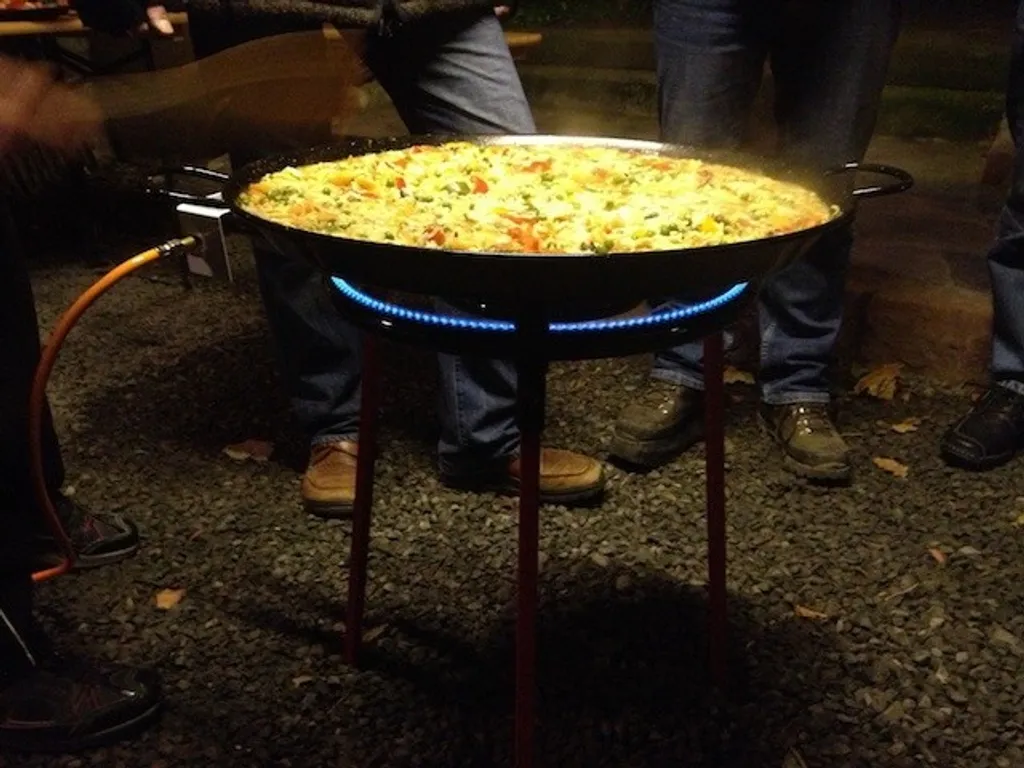 Hier bieten wir die größere Variante mit einem zweiflammigen Ringbrenner in 40 cm Durchmesser und der passenden Paellapfanne mit 46 cm Durchmesser für maximal 12 Personen. Die Bilder stammen zum Teil von unserem Team beim Kochen einer Winterpaella 😉