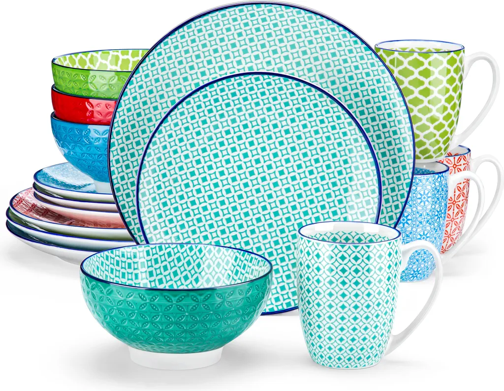 - 16-teiliges Set besteht aus 4 Kaffeebechern 360 ml, 4 Müslischalen Ø 15,2 cm, 4 Dessertteller Ø 21,5 cm und 4 Speisetellern Ø 26,5 cm. Zeitlose Form- und Farbgebung, innovatives Design und hochwertige Verarbeitung – bei allen Geschirrteilen sind die Dekoration vollflächig aufgebracht und perfekt zueinander abgestimmt, perfekt für den gedeckten Tisch!