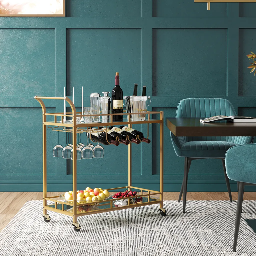 VASAGLE Servierwagen, Rollwagen, Gläserhalter, 2 Verspiegelte Glasablagen, Barwagen, Weinwagen, Für Küche, Esszimmer, Bar, Goldfarben