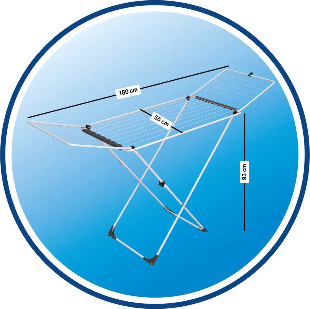 Sind die beiden Flügel ausgeklappt, ist der Vileda Universal knapp 2 Meter lang und ungefähr 55 Zentimeter breit. Auf 18 Metern Trockenlänge können Sie Socken, Hosen und T-Shirts trocknen – insgesamt etwa zwei Waschmaschinenladungen.