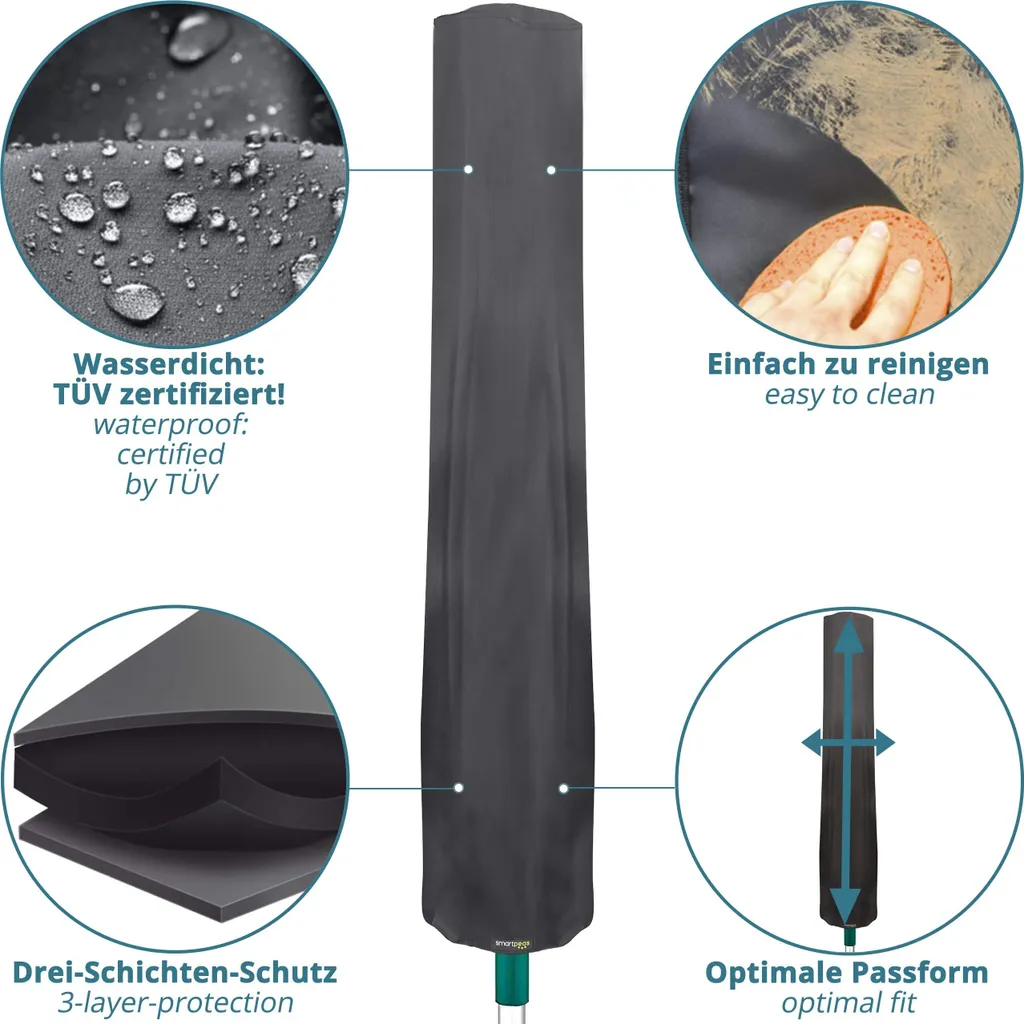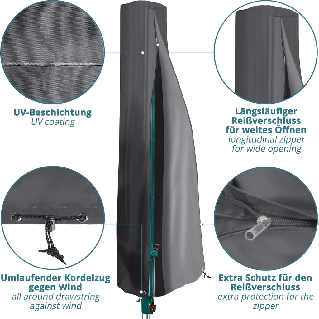 - REIßVERSCHLUSS ÖFFNUNG: Diese Abdeckung hat einen längsseitigen Reißverschluss, welcher das Über- und Abziehen der Hülse von der Wäschespinne extrem vereinfacht. Der Reißverschluss ist durch einen extra Materialüberwurf geschützt und verhindert das Eindringen von Schmutz und Feuchtigkeit