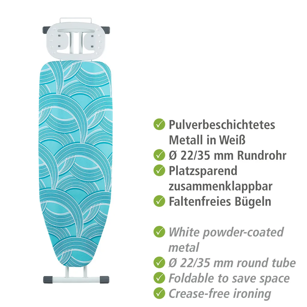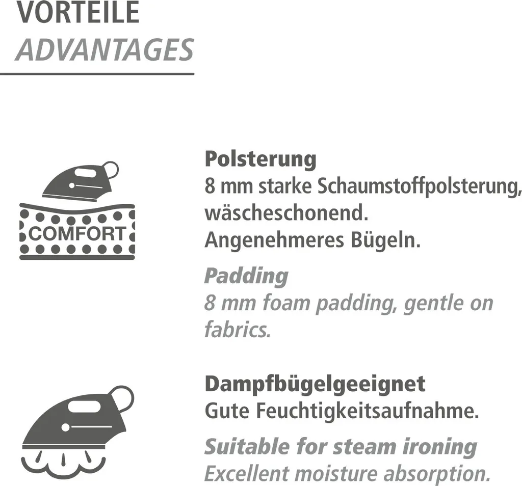 Mit Bügeltischbezug und Ablage: Der Bügeltisch ist mit einem dampfdurchlässigen Bezug in frischem Blau aus robustem Baumwollgewebe und weicher, extra-dicker Schaumstoffschicht mit 8 mm ausgestattet, was ein sanftes und faltenfreies Bügeln ermöglicht
