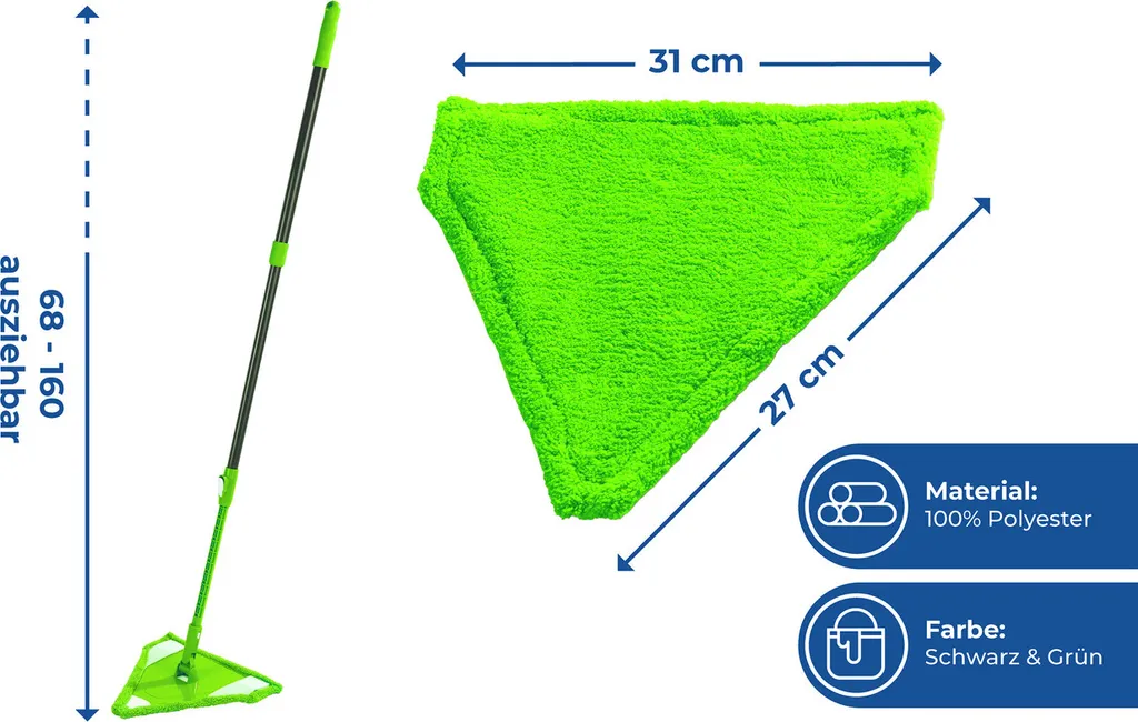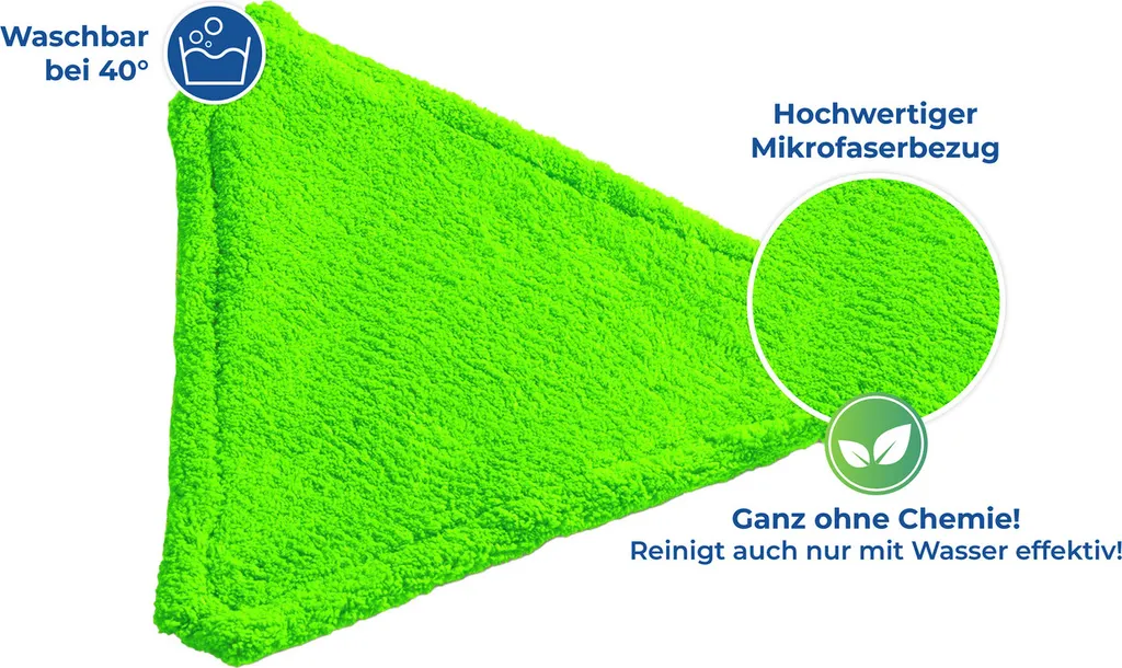Das große Dreieck des cleveren Wischmops ist ideal, um auch großflächig zu reinigen. Der stufenlos ausziehbare Teleskopstiel (bis zu einer Gesamtlänge von ca. 160 cm) ermöglicht eine einfache, rückenschonende Hausarbeit. Der abnehmbare, hochwertige Mikrofaserbezug entfernt selbst hartnäckigsten Schmutz und kann bei 40ºC gewaschen werden.