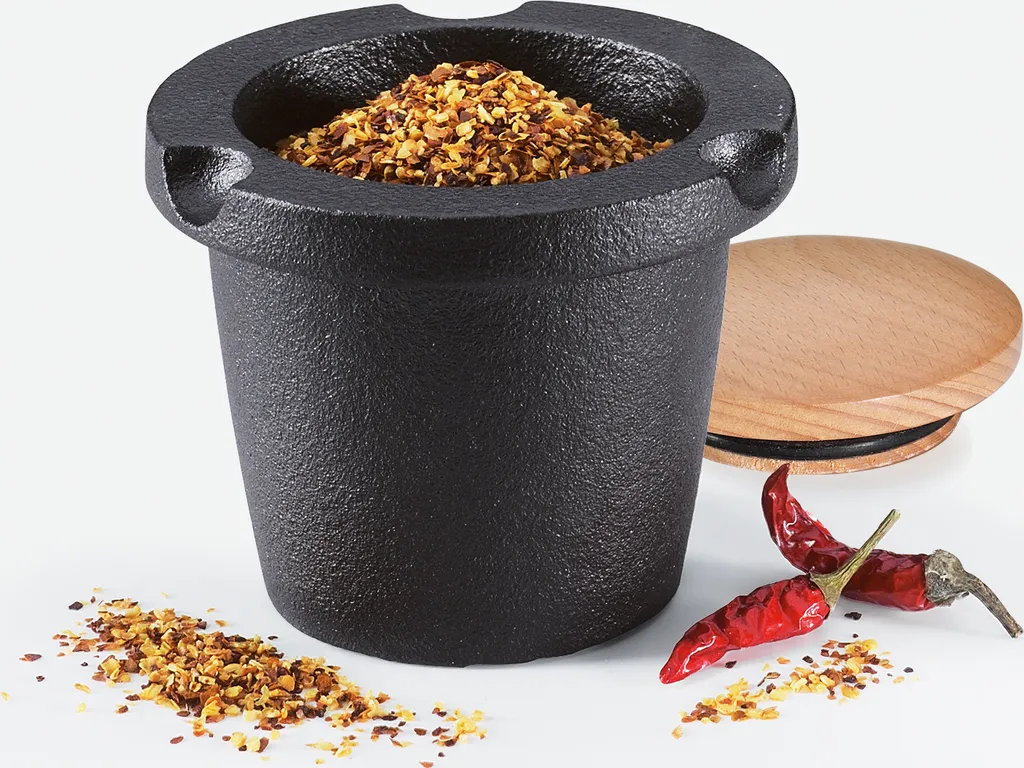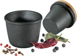 - Gewürz-Reibe / – Mörser mit spezieller Bodenriffelung und Vorratsfach aus robustem Gusseisen