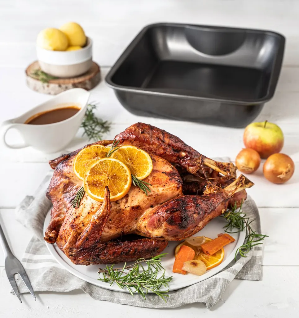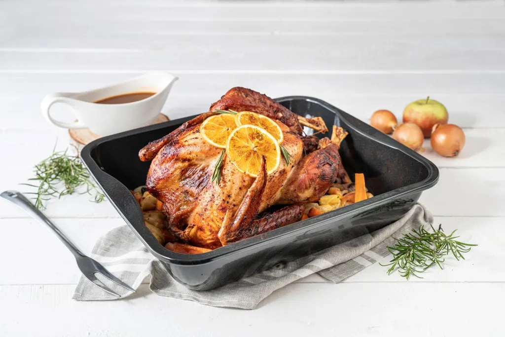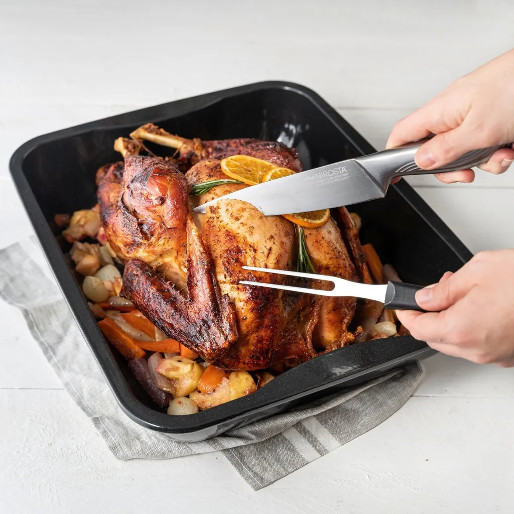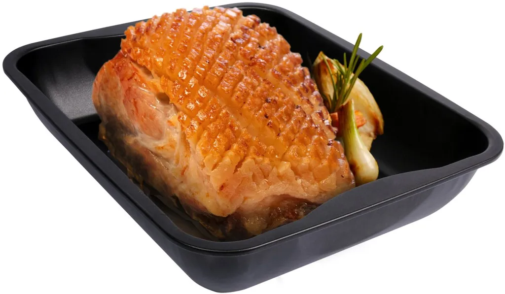 Die Bratform ist mit einer Diamant-Emaille Beschichtung versehen, die Temperaturen bis ca. 400 °C widersteht und eine absolut schnittfeste Oberfläche aufweist. So ist selbst das Tranchieren in der Form gefahrlos möglich.